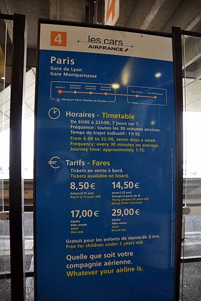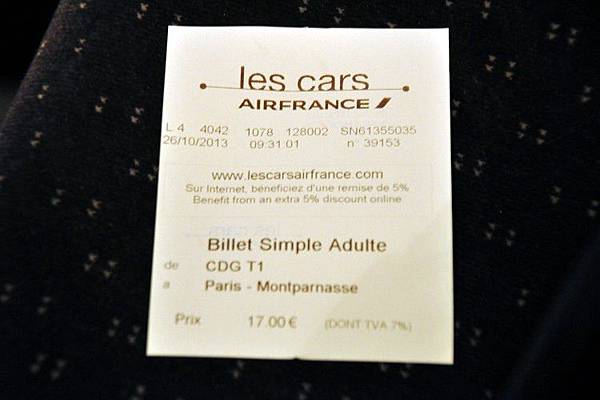 進巴黎市區除了計程車外,費用最貴的算是法航巴士了,若以小氣的我的思考,可能會去搭RER B線進市區,但是考慮拖著行李上下麻煩(其實是怕被老婆念),所以多花點錢絕對是值得的。