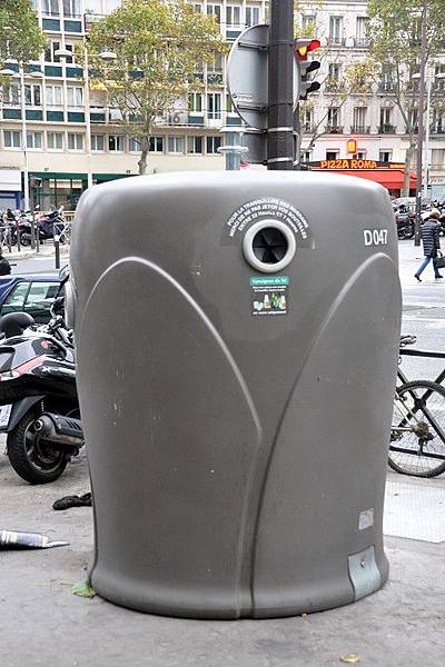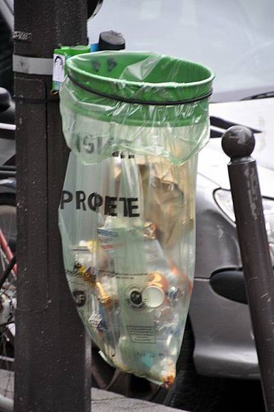 巴黎路上的垃圾桶,沒有外面的桶子,上面一個圓框,下面垂著透明塑膠袋。據說這用意是方便檢查裡面有無爆裂物,巴黎這樣的國際都會、法國的仇家也不少,對恐怖攻擊當然會防著點。只是看到大大的資源回收桶,外殼就是不透明的,要放爆裂物,放裡面就好。